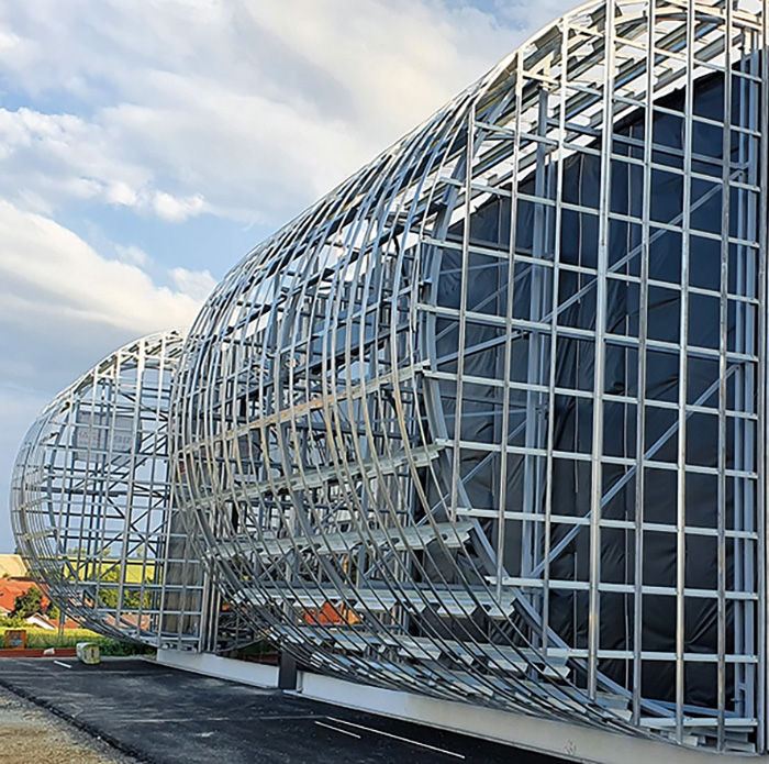 Their process includes creating dome panels with prefabricated folds, facilitating rapid installation and mechanical folding for a flawless, evenly rounded surface. Special solutions such as 3D cambering and self-supporting dome structures with internal TIG-welded flanged folds are also available, ensuring smooth, seamless finishes without manual creasing marks.