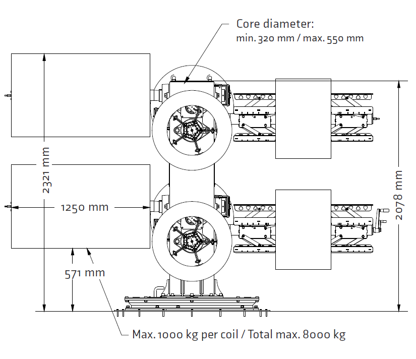 - Flexibility: Compatible with coil widths up to 1,250 mm and core diameters from 320 mm to 550 mm