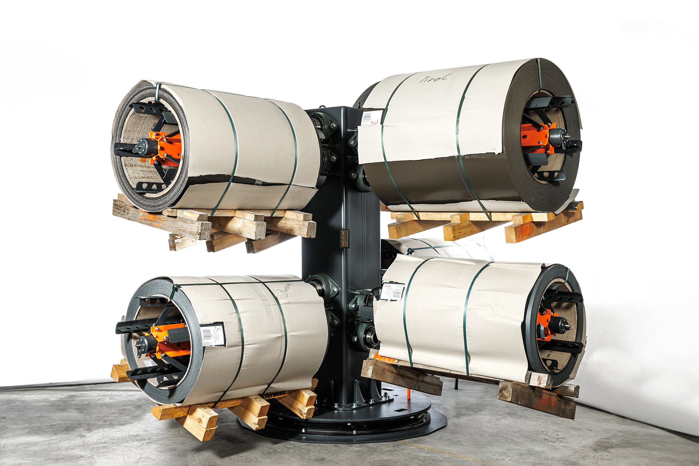The Coiltwister rotates, allowing coils to be processed from multiple directions. For example, you can set up a slitting machine on one side and a roll-forming machine on the other. Turn it 90°, and there’s room for a third machine.