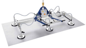 The AERO-BASIC is a modular vacuum lifting device designed for the horizontal transport of sheet metals, plastics, and various panels. The device is highly configurable based on the number of suction plates and crossbeams required for the load size, with a lifting capacity of up to 2000kg.
