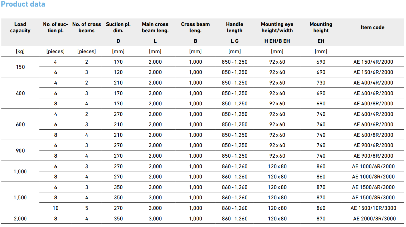 - Variants: Different suction plate diameters, cross beam lengths, handle lengths, suspension eyes, etc.
