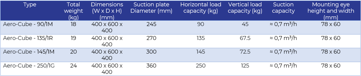 • Suction plate: Ø 270 mm 135 kg horizontal / 67.5 kg vertical
