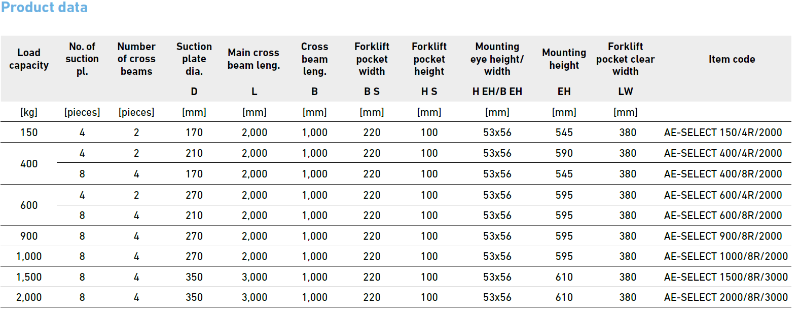 • Variants: Different suction plate diameters, cross beam lengths, handle lengths, suspension eyes, etc.