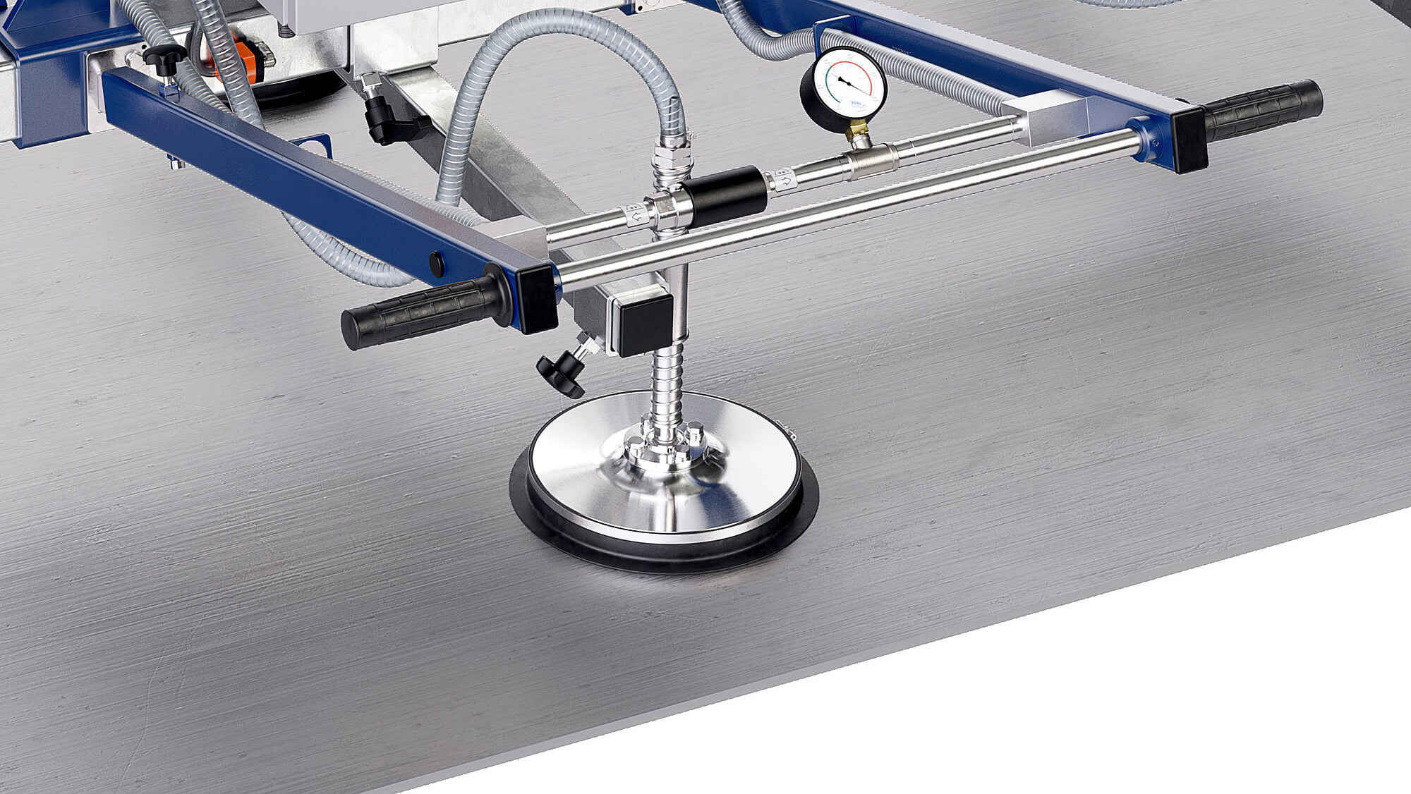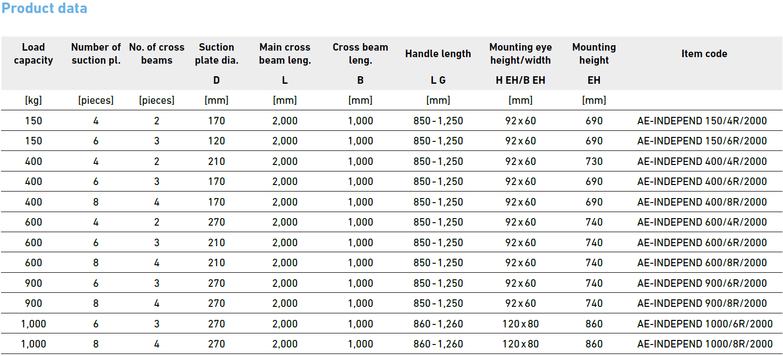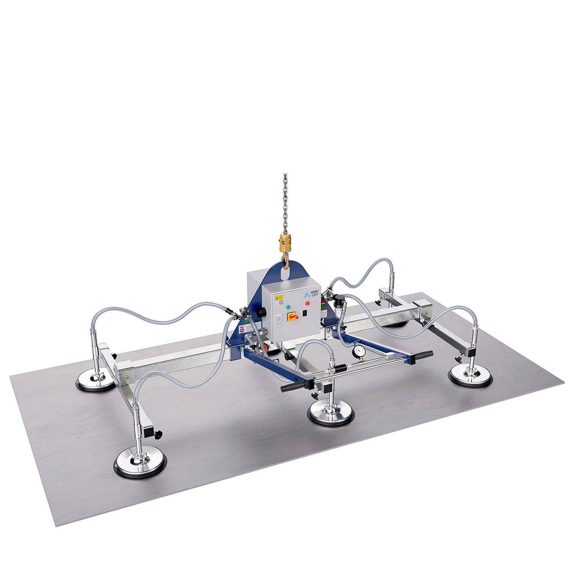 It has a modular design used for the horizontal transport of sheet metals, plastics, and various panels. The device is highly configurable based on the number of suction plates and crossbeams required for the load size, with a lifting capacity of up to 1000kg.