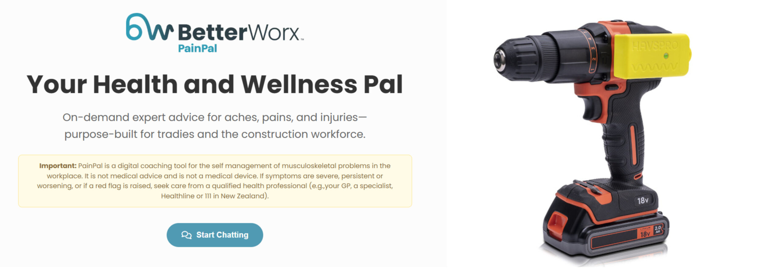 PainPal is an AI-powered tool created by CHASNZ ergonomists, offering on-demand advice for aches, pains, and injuries, purpose-built for tradies.